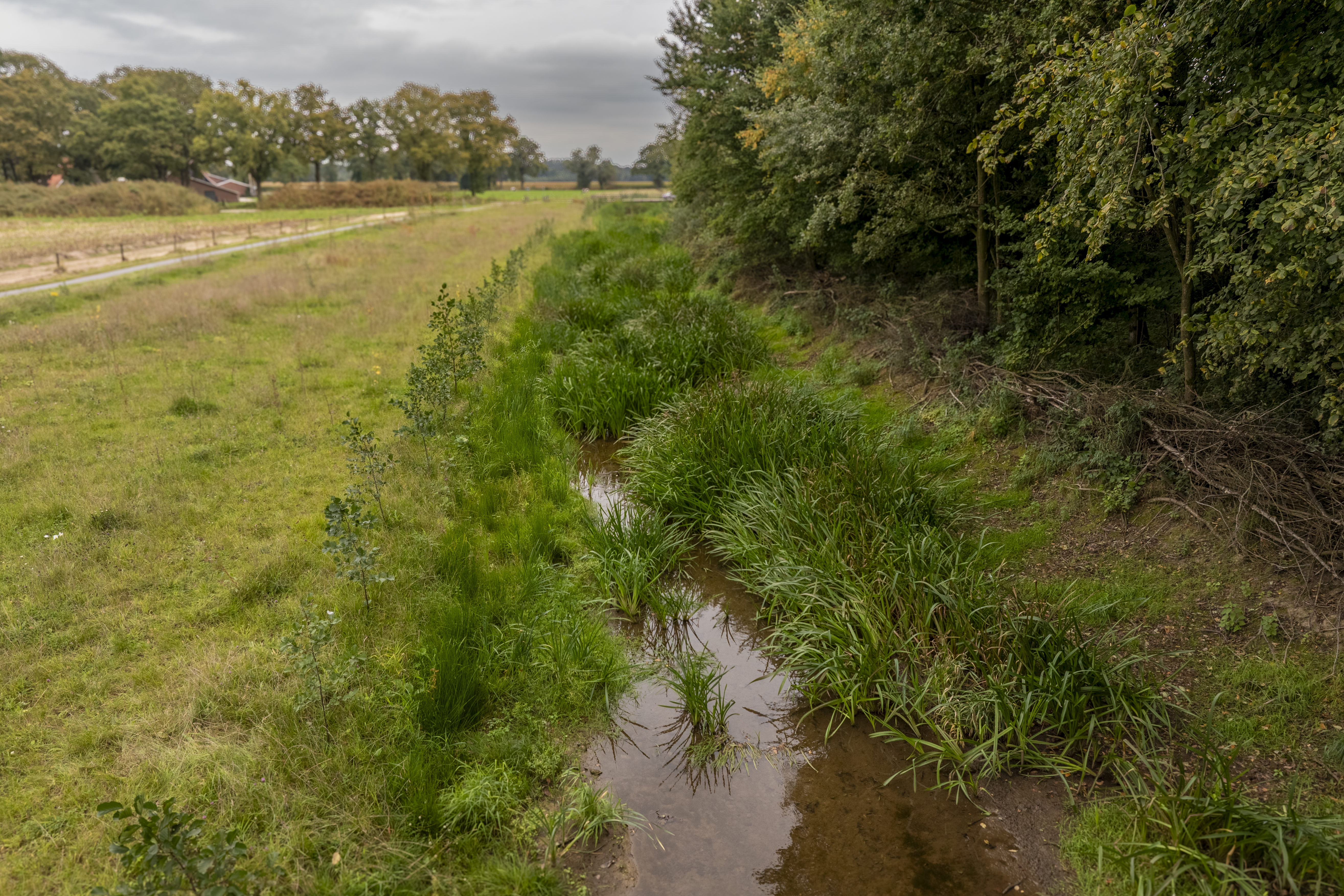 De zuidelijke oever is beperkt aangepast. We hebben de begroeiing aan de zuidkant ook zoveel mogelijk behouden. De noordelijke oever is wel behoorlijk veranderd. In januari hebben we hier nieuwe bomen en struiken geplant. Denk bijvoorbeeld aan zwarte els, haagbeuk, winterlinde en hazelaar. Op dit moment ziet de beek er nog kaal uit. Maar binnen enkele maanden zijn de oevers weer begroeid. Over een paar jaar is het bosplantsoen volledig aangeslagen.