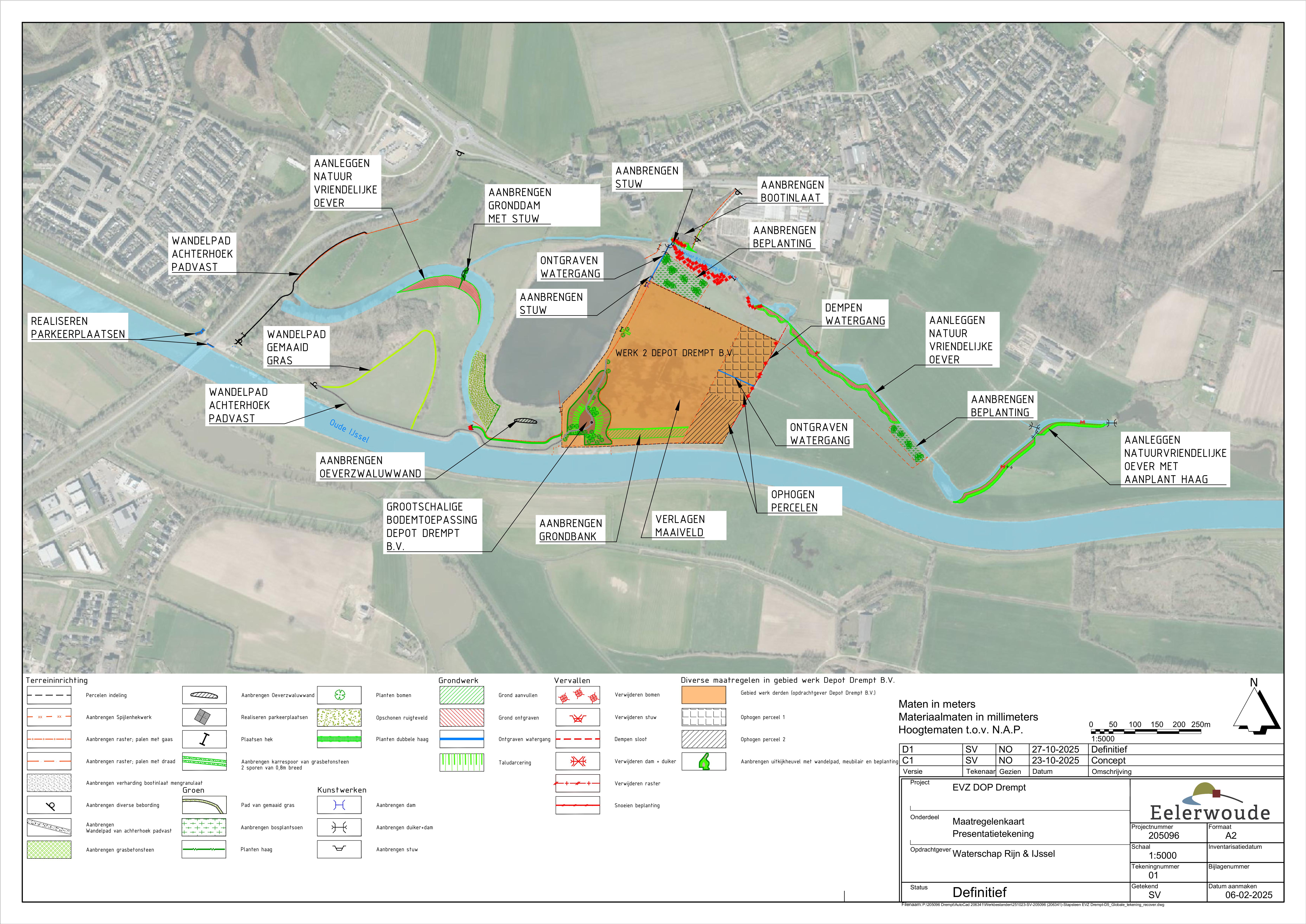 We vinden het belangrijk om met de mensen die grond bezitten en in de buurt wonen te praten over de plannen. De afgelopen jaren hebben we hier veel aandacht aan besteed. Daarna maakten we een plan voor de inrichting van het gebied. Dit plan hebben we op 5 november 2025 laten zien tijdens een informatieavond. Het was een goedbezochte avond, waar medewerkers van de provincie en het waterschap vragen hebben beantwoord en toelichting gegeven op de plannen. Bezoekers die een informatieformulier hebben ingevuld met een e-mailadres krijgen van ons antwoord via de mail. De presentatietekening staat hieronder: