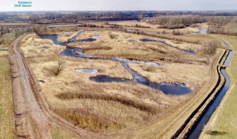 Op bovenstaande afbeelding zie je een sfeerbeeld van de inrichting van het natuurgebied. De kijkrichting is zuidwest vanaf Drempt.